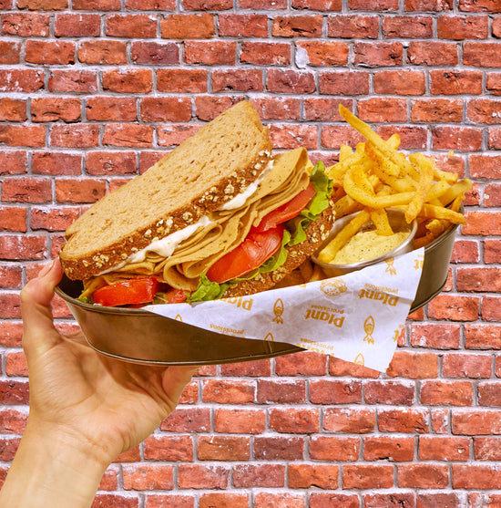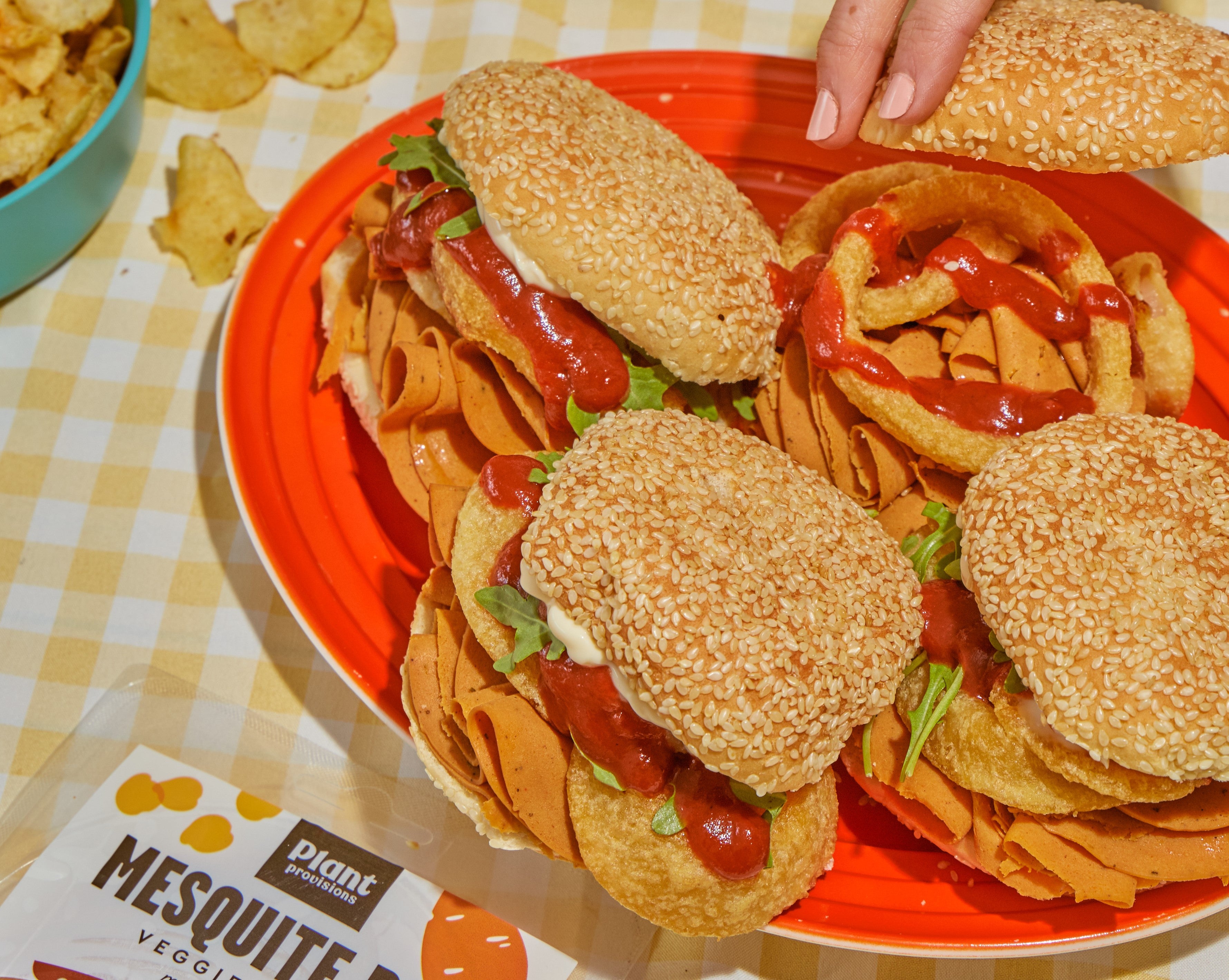 3. Make your sandwiches! Toast the hamburger buns, then layer on the Sriracha BBQ sauce and the Plant Provisions Mesquite BBQ slices. Top with the onion rings and arugula, and enjoy!