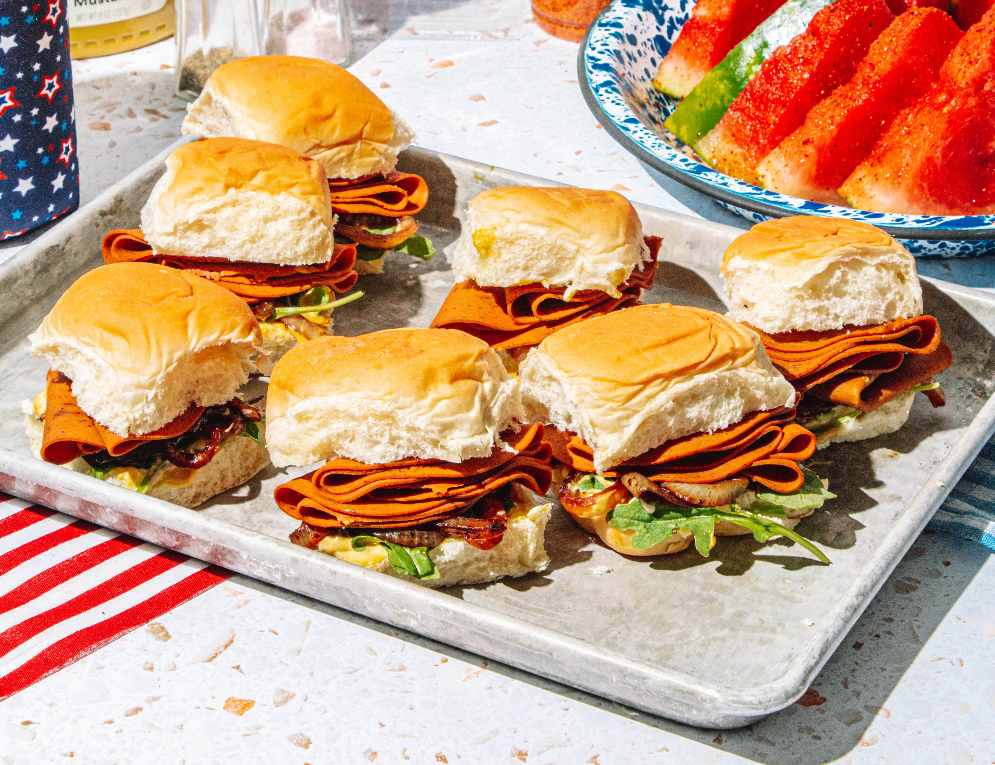 - Slice your slider buns in half and spread the vegan mayo and mustard over it evenly. Add your arugula and drizzle with olive and sprinkle with salt and pepper. Layer your grilled onions and then your Plant Provisions Chipotle Slices. Top with the other half of slider buns and enjoy!